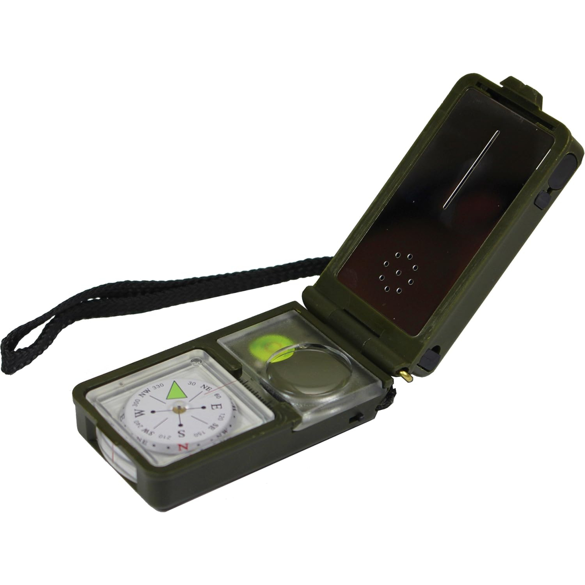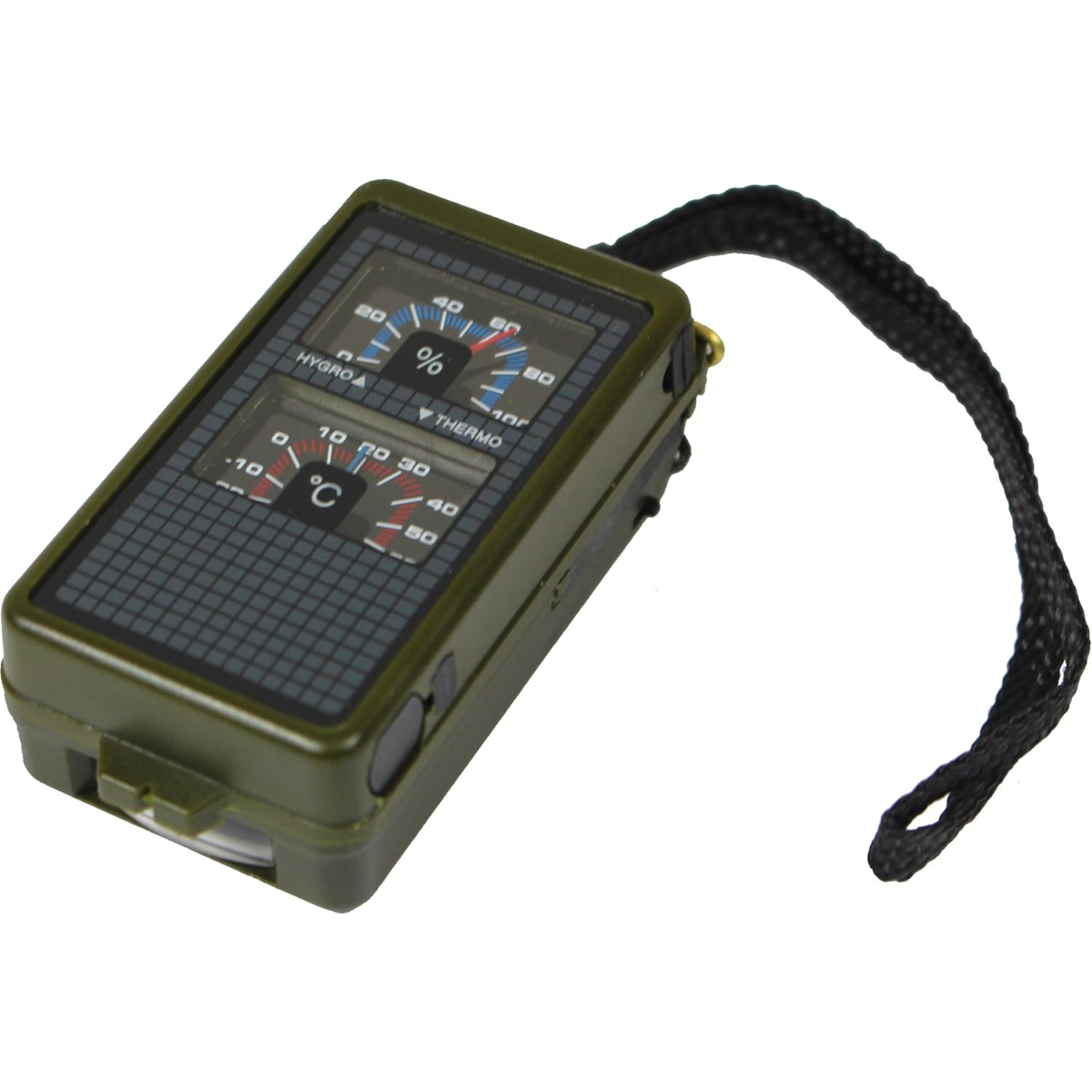 10 fonctions : Boussole avec cadran lumineux, mesure de la température et de l'humidité, miroir de signalisation, loupe, règle, niveau à bulle, mini-torche LED, silex et sifflet.