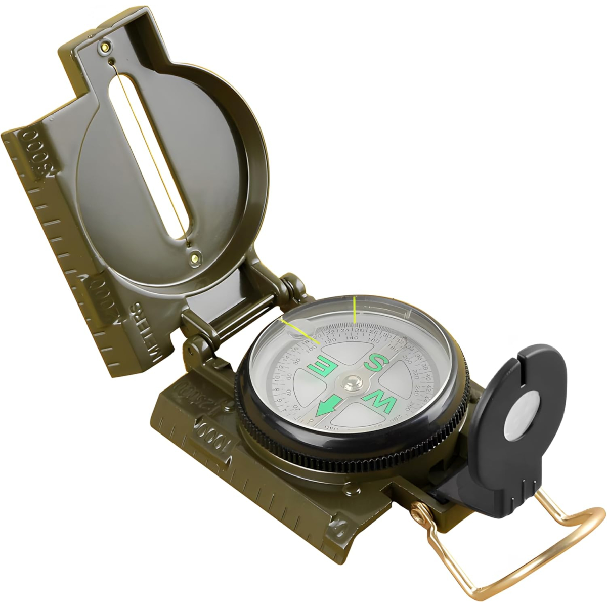 Boitier métal avec système de visée escamotable, graduation en degrés et millièmes, échelle 1/25 000, loupe de lecture.