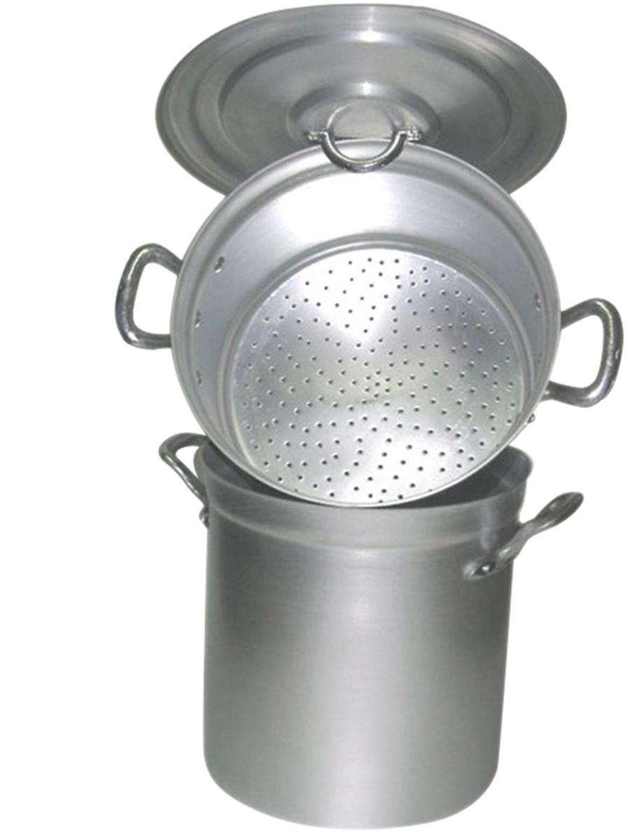 Marmite, panier vapeur, couvercle et anses en aluminium.