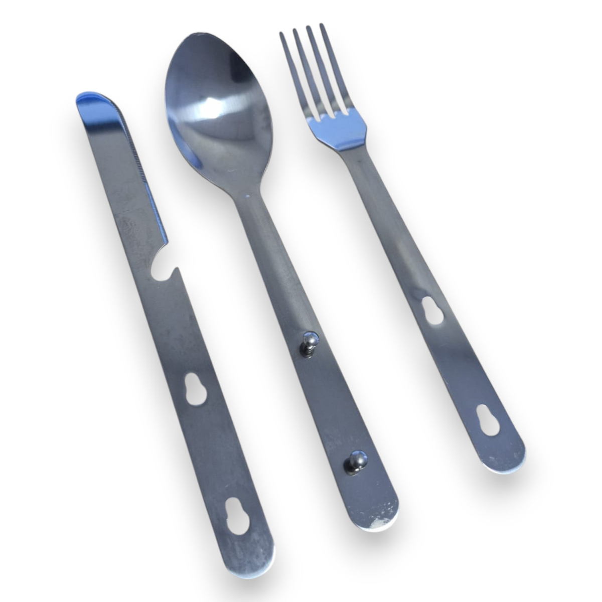 Couvert inox 3 pièces, une fourchette , une cuillère et un couteau avec attache permettant de tenir les trois pièces.