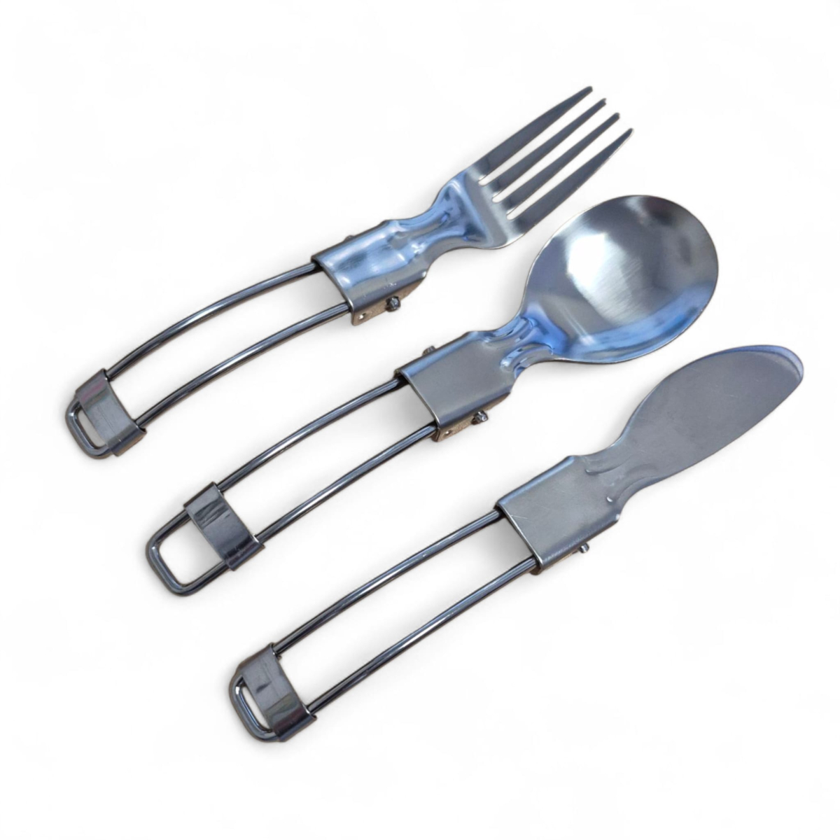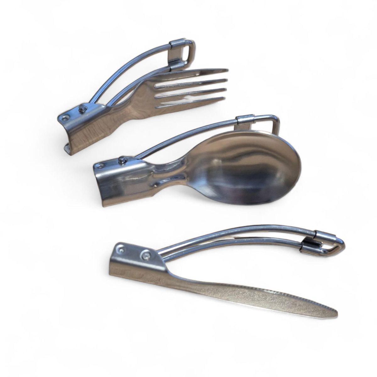 Couvert en inox pliants 3 pièces, une fourchette , une cuillère et un couteau .
