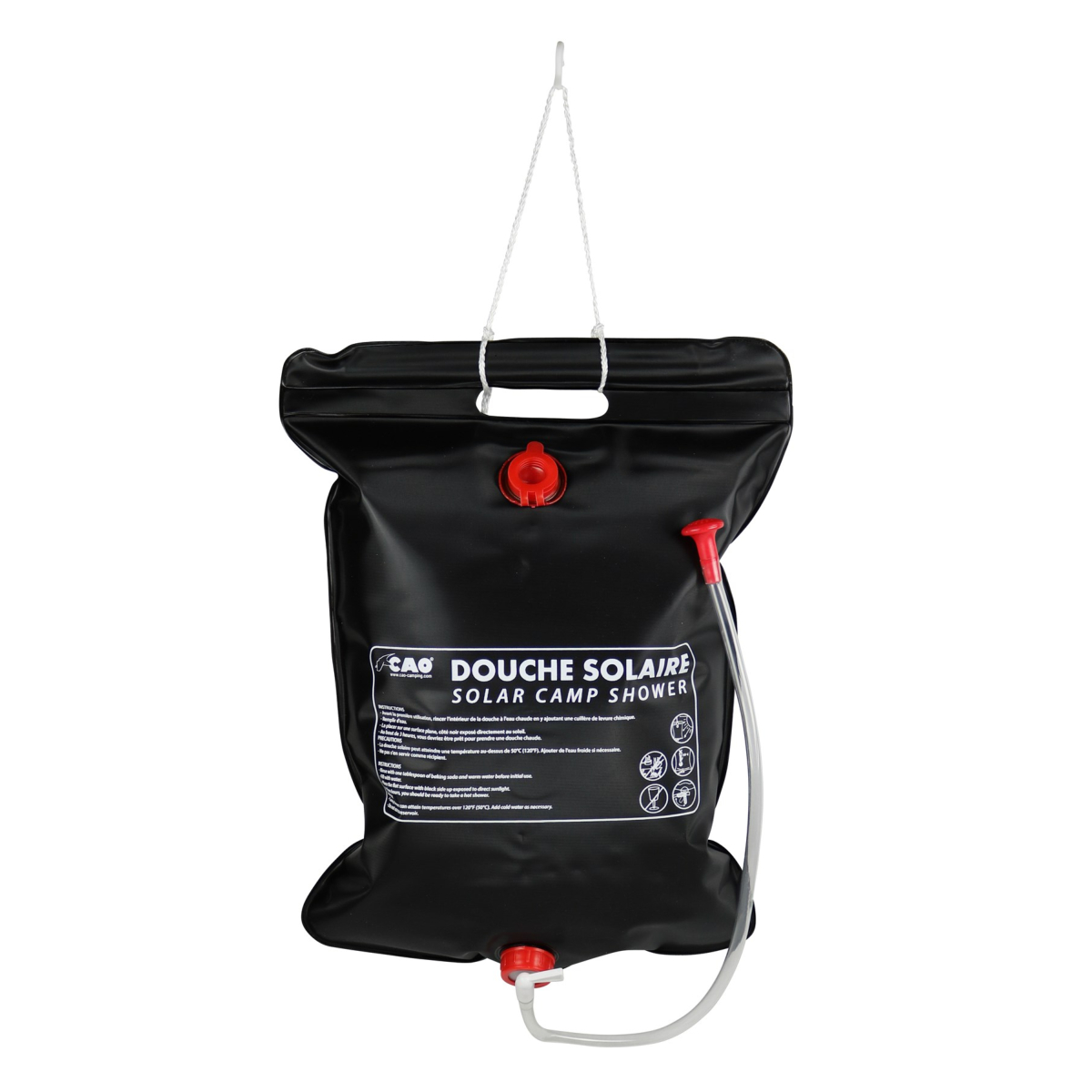 Douche solaire 10 L ou 20 L avec douchette et tuyau, poignée de portage.