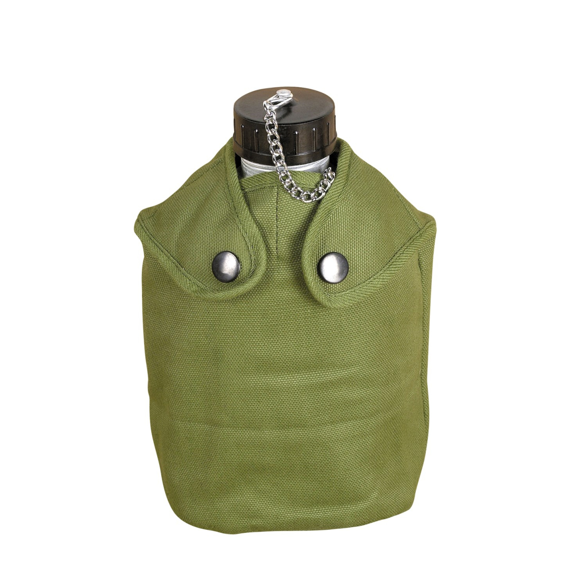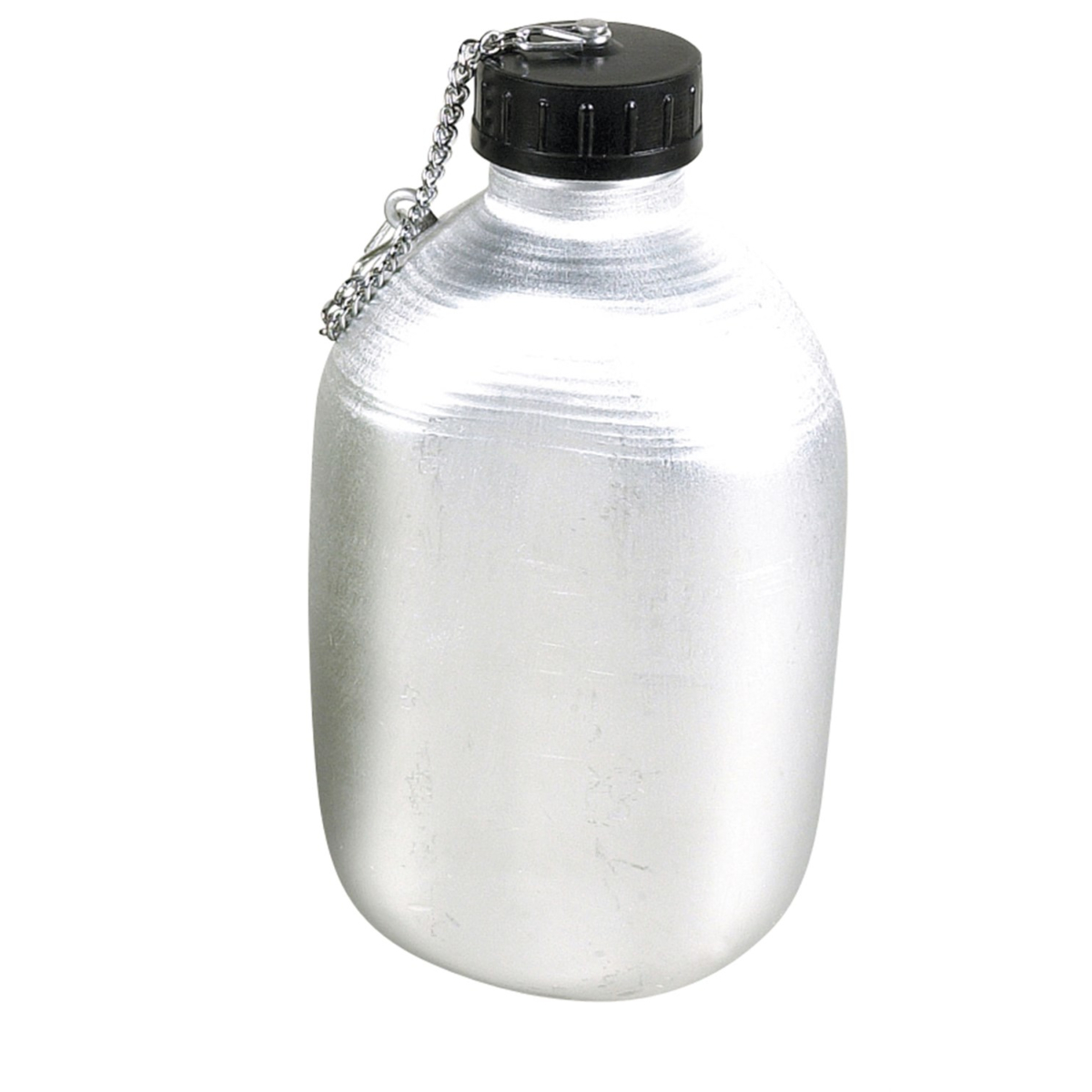 Gourde armée type M52, en aluminium. Bouchon à vis avec joint et chaînette solidarisée à la gourde.