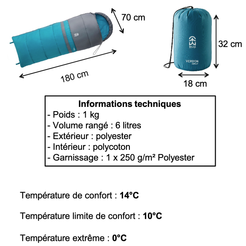 Sac de couchage Verdon Junior. Parfait pour les plus jeunes pour une utilisation en été ou mi saison.