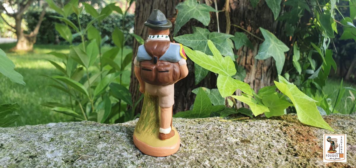 Santon modèle Éclaireur, CP SUF avec sac au dos et fanion de patrouille par le santonnier Fouque (Aix en Provence),